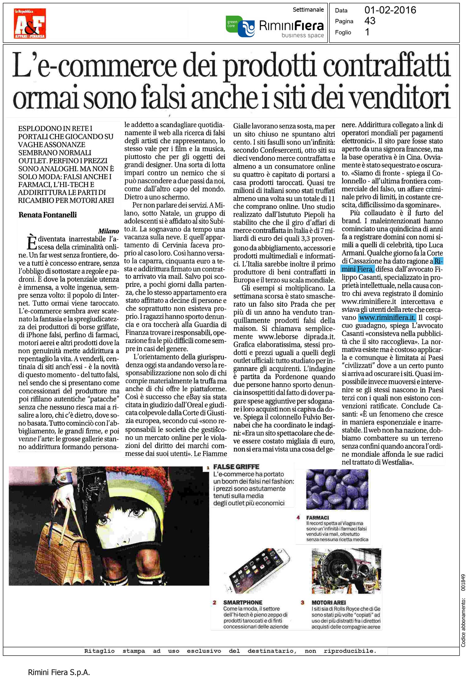 L’articolo pubblicato su *Affari & Finanza di la Repubblica il 1° febbraio 2016 affronta il crescente fenomeno della vendita di prodotti contraffatti attraverso piattaforme di e-commerce, evidenziando le sfide legali e le implicazioni economiche associate.
